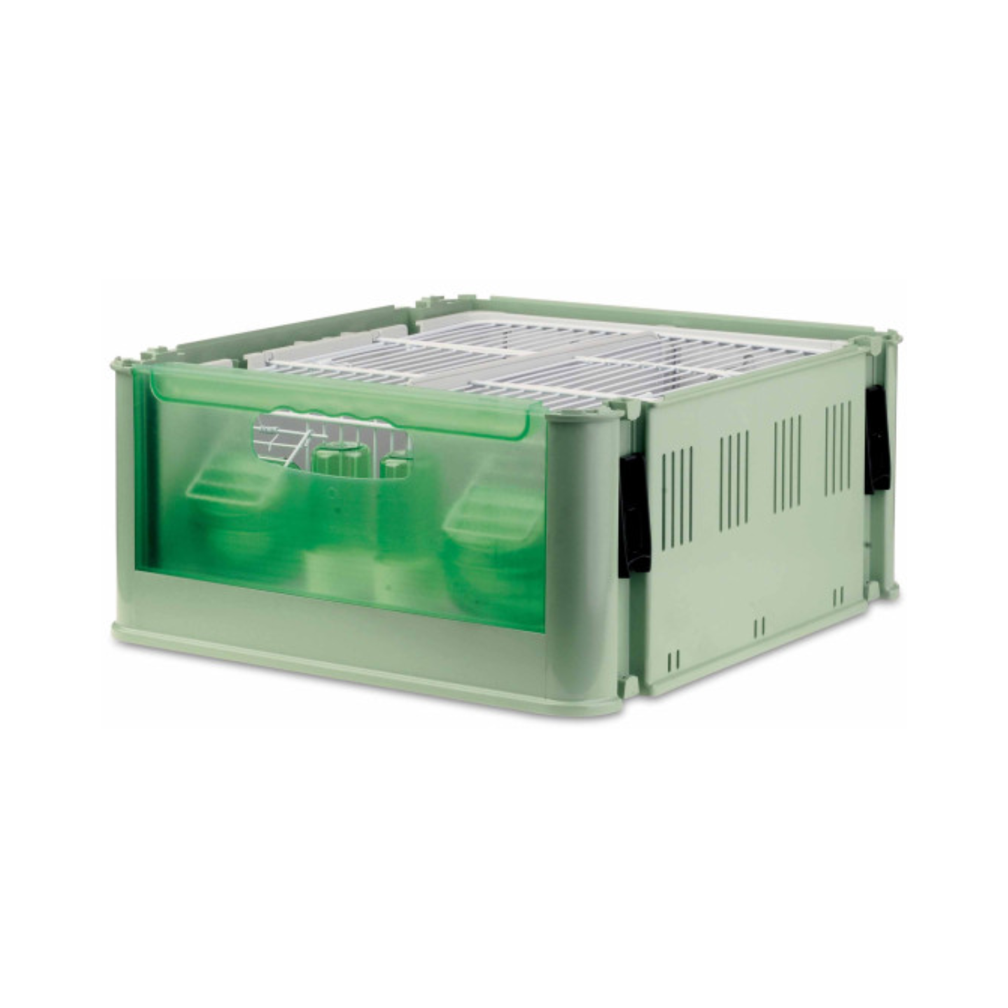 Cage de transport de couleur verte avec intérieur amovible et mangeoires extérieures.