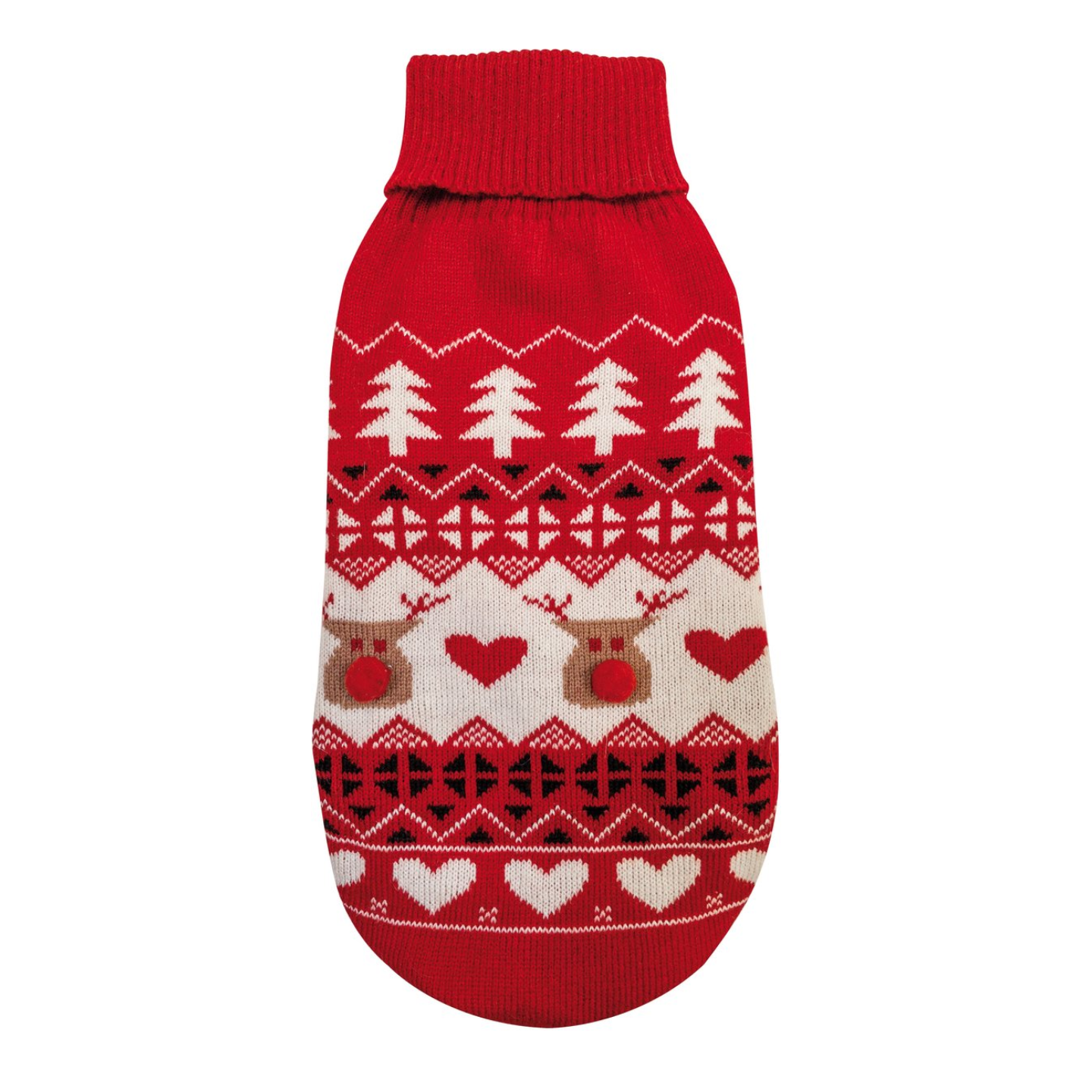 Celui-ci est complètement exécuté dans une ambiance de Noël. Le pull a une couleur de base rouge, avec un joli imprimé d’arbres de Noël, de diamants, de cœurs et bien sûr de rennes, avec un nez rouge en trois dimensions.