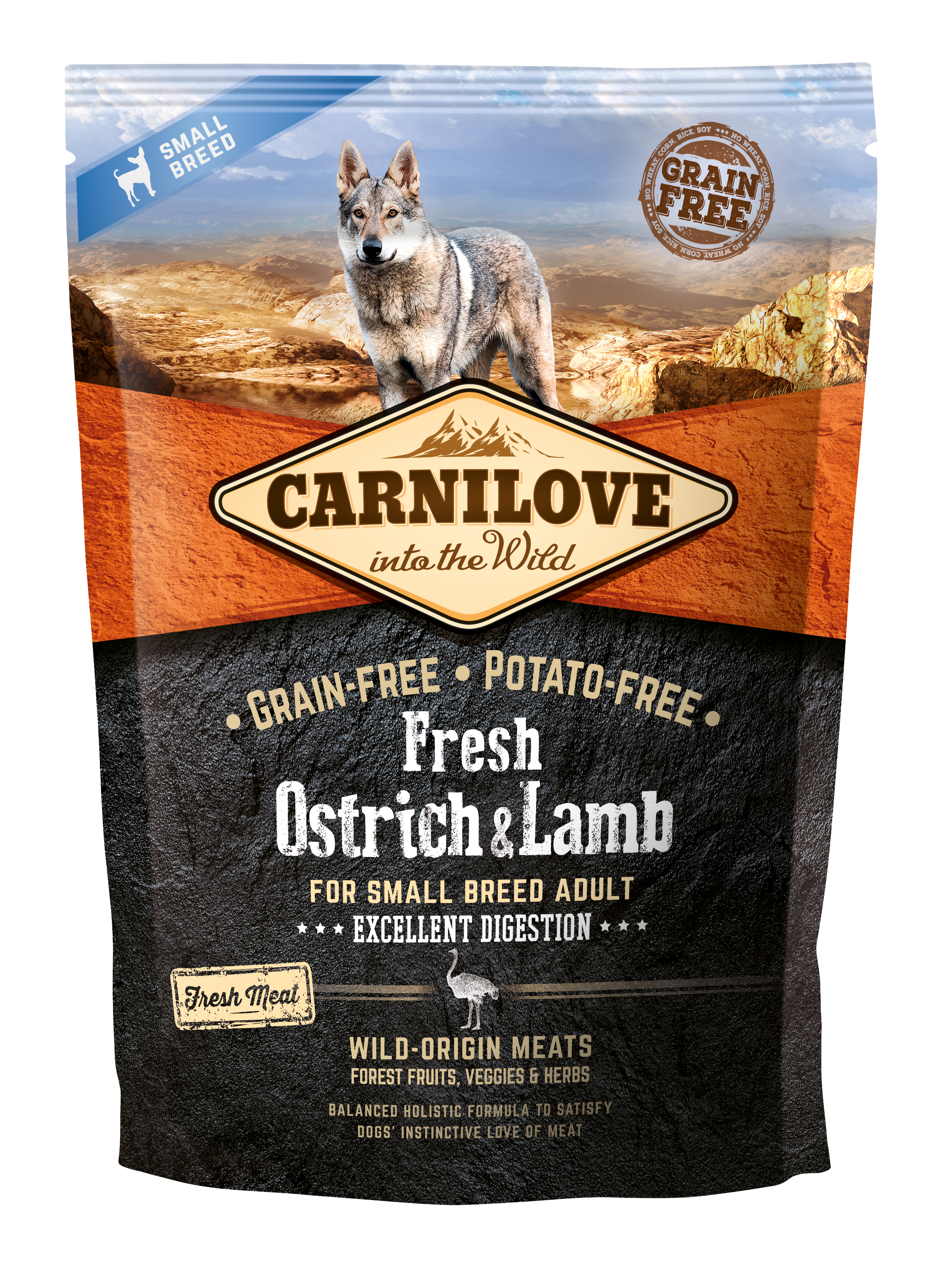 autruche fraîche, désossée (26 %), agneau séché (20 %), dinde séchée (20 %), graisse de poulet (conservée par des tocophérols, 9 %), citrouille, pois chiches, pois, foie de poulet (3 %), huile de saumon (2 %), pommes, carottes, graine de lin, coquilles de crustacés hydrolysées (source de glucosamine, 0,026 %), extrait de cartilage (source de chondroïtine, 0,016 %), levure de bière (source de manno-oligosaccharides, 0,015 %), racines de chicorée (source de fructo-oligosaccharides, 0,01 %), Yucca schidigera (0,01 %), algues (0,01 %), psyllium (0,01 %), thym (0,01 %), romarin (0,01 %), origan (0,01 %), airelles (0,0008 %), myrtilles (0,0008 %), argousier (0,0008 %), racine de gingembre (0,0008 %), sauge (0,0008 %)