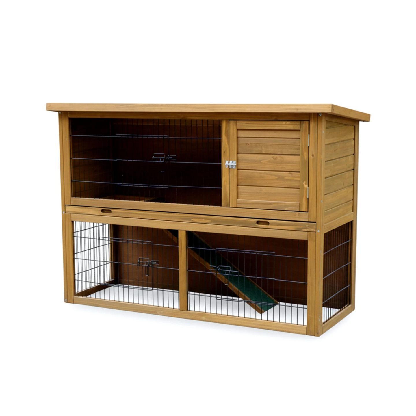 Grâce à sa longueur et à sa conception à deux niveaux, ce clapier offre un espace exceptionnel permettant aux grandes races ou aux couples de s’étirer, d’explorer et de vivre confortablement.