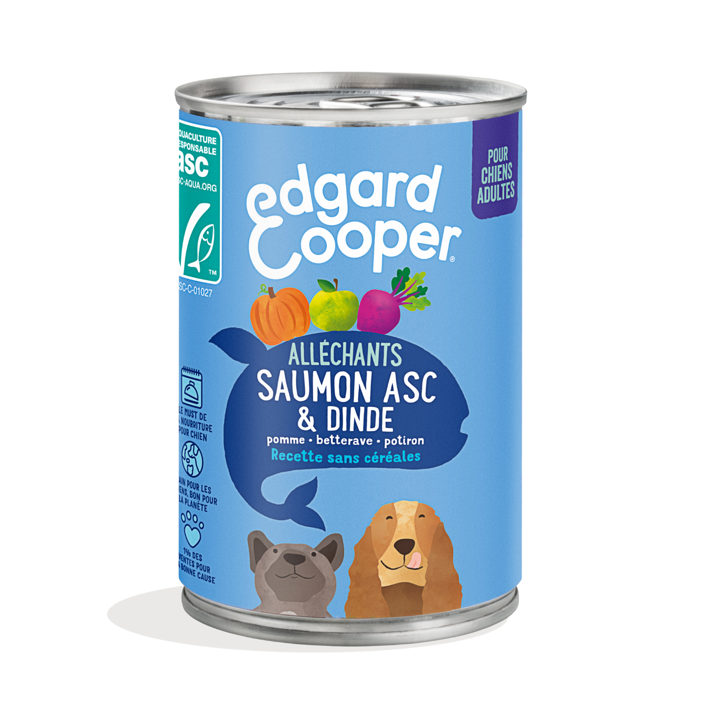 Riche en saumon et dinde succulents, cette recette sans céréales est une excellente source de protéines. Le saumon contient des protéines équilibrées et faciles à digérer, et fournit des Oméga-3 et des graisses bonnes pour la santé. La dinde est une viande maigre absolument délicieuse et riche en protéines. Cette recette contient également des prébiotiques, qui favorisent la bonne santé des intestins. De plus, nous y avons ajouté des abats nobles (tels que le cœur et le foie) pour une dose de nutriments supplémentaire, ainsi qu’un mélange super équilibré de fruits, légumes, herbes et plantes qui boostent encore son apport nutritionnel. Nous cuisons le tout à basse température, pour un maximum de saveur et de bienfaits.