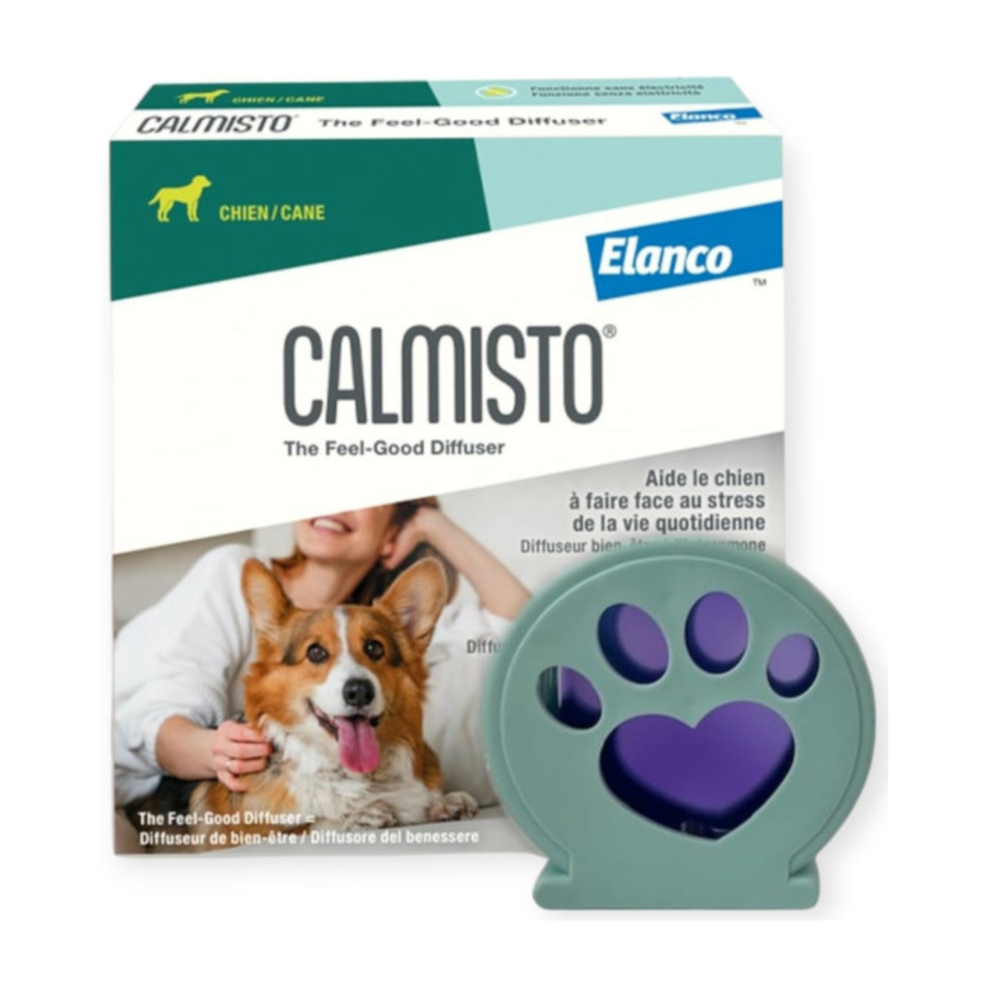 Kit diffuseur anti-stress chien rechargeable Calmisto de Elanco, sans calmant ni sédatif, il aide votre chien à gérer le stress grâce à une diffusion naturelle et continue.