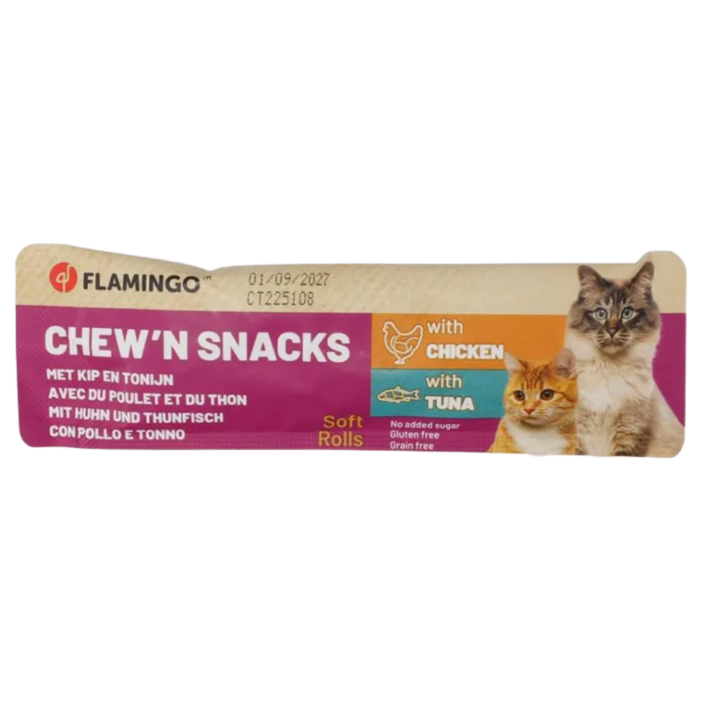Faites plaisir à votre chat avec les délicieuses friandises rondes Chew’n, pleines de poulet et de thon !