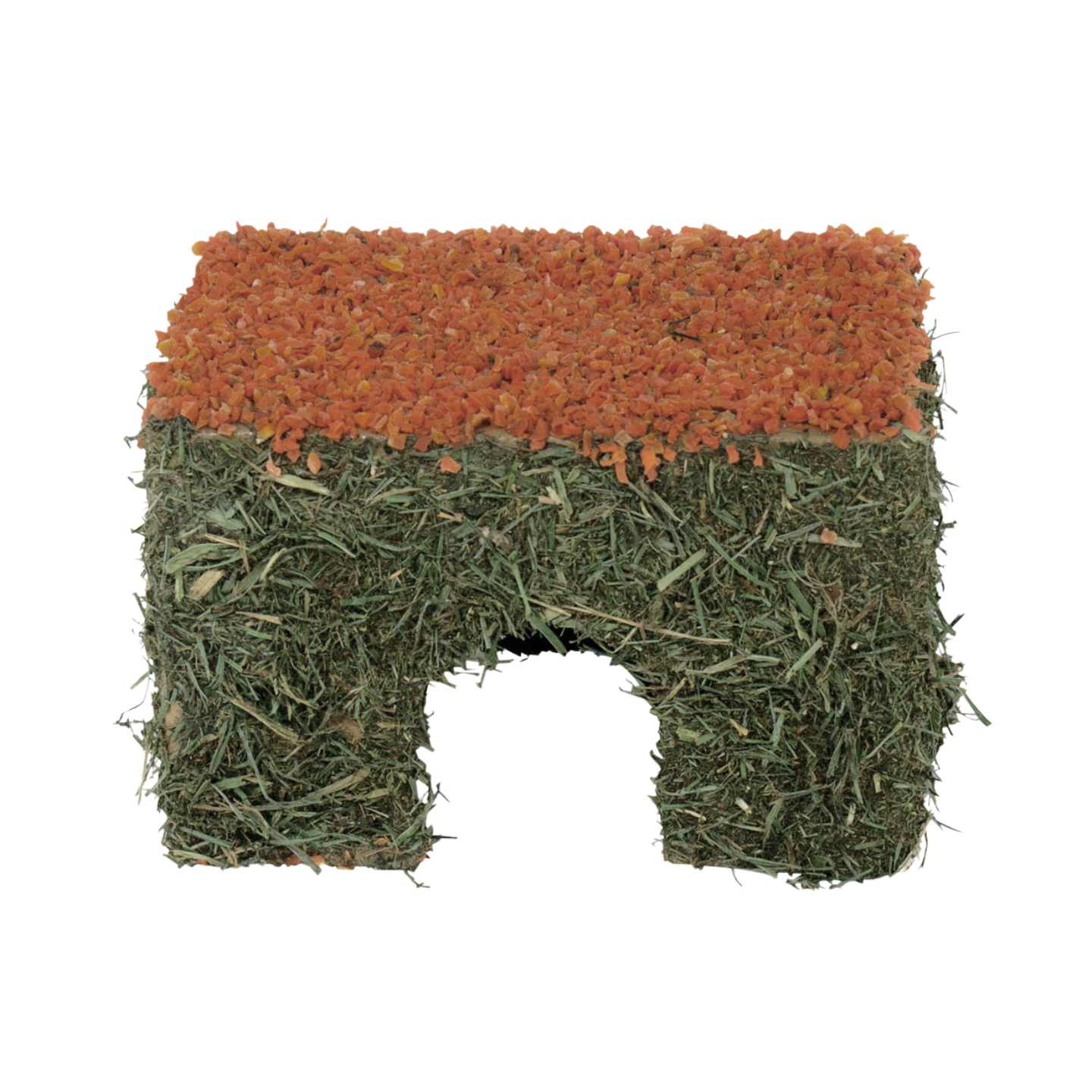 La maison foin et carotte est recouverte d’un mélange de foin de prairie de montagne aromatique et d’un toit de morceaux de carottes croquants.