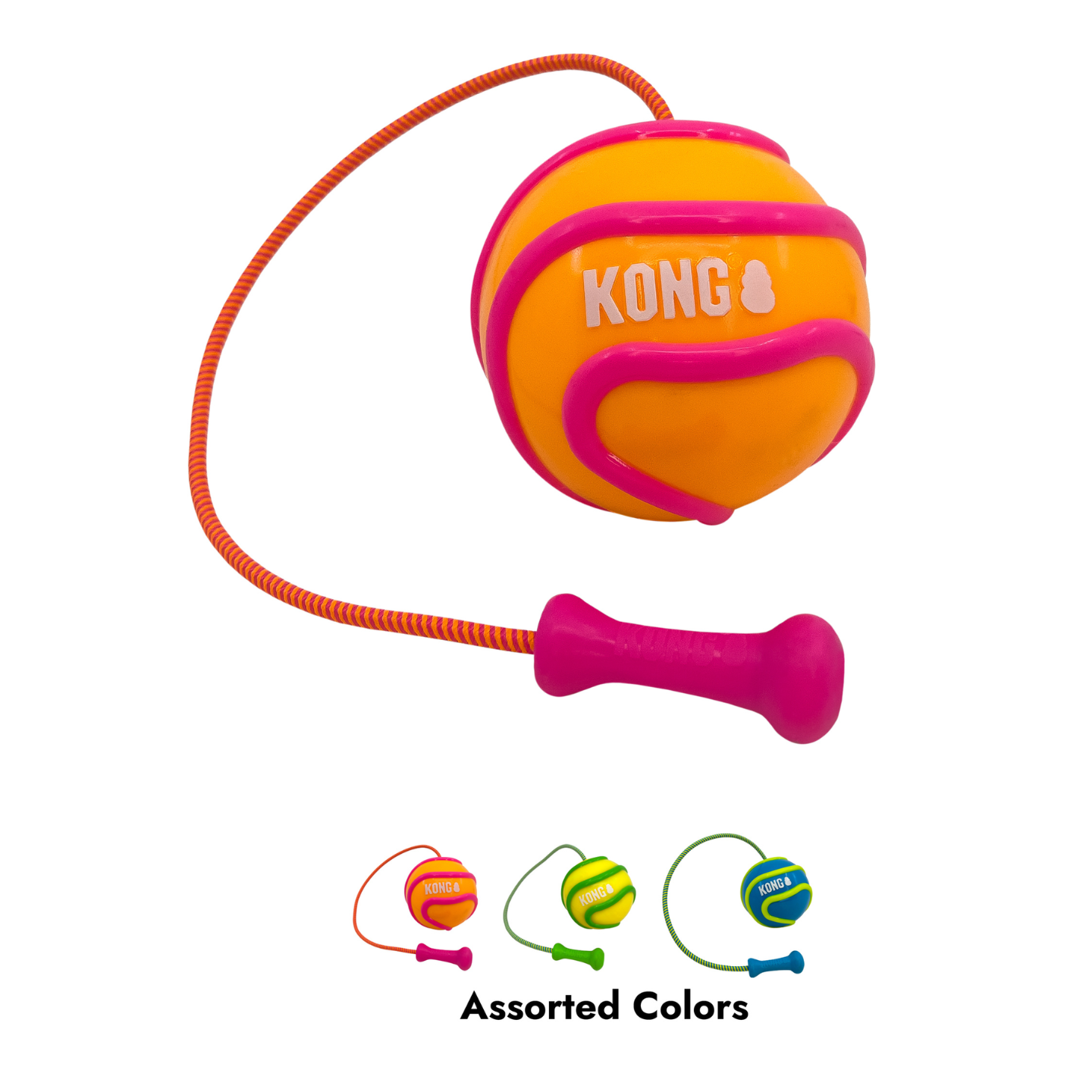 Idéale pour le jeu de rapporter, cette balle résistante est dotée de nervures surélevées qui créent un rebond imprévisible, et d’une corde élastique ergonomique qui la propulse sans effort sur de longues distances.