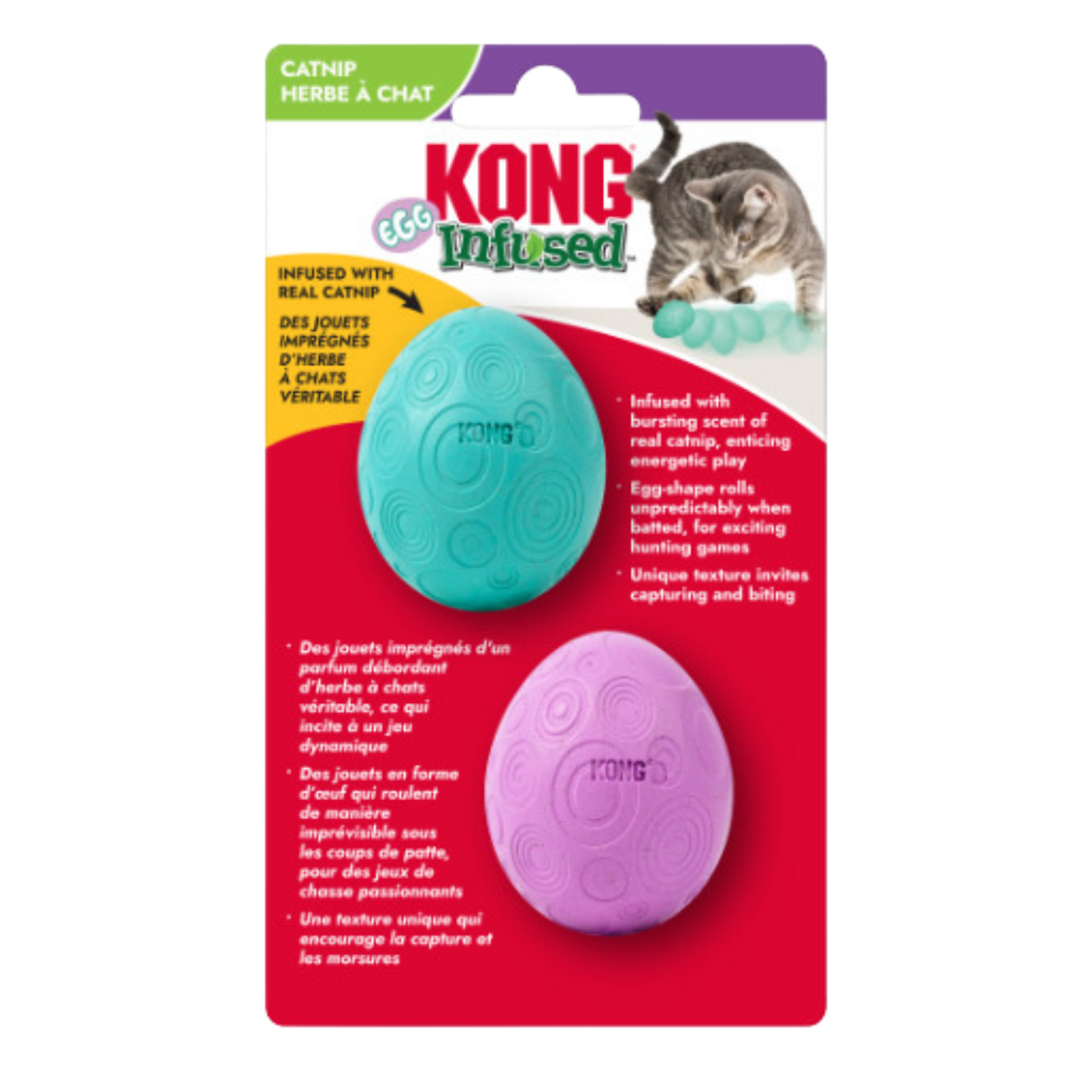 Découvrez les œufs de la marque KONG infusés en herbe à chat.