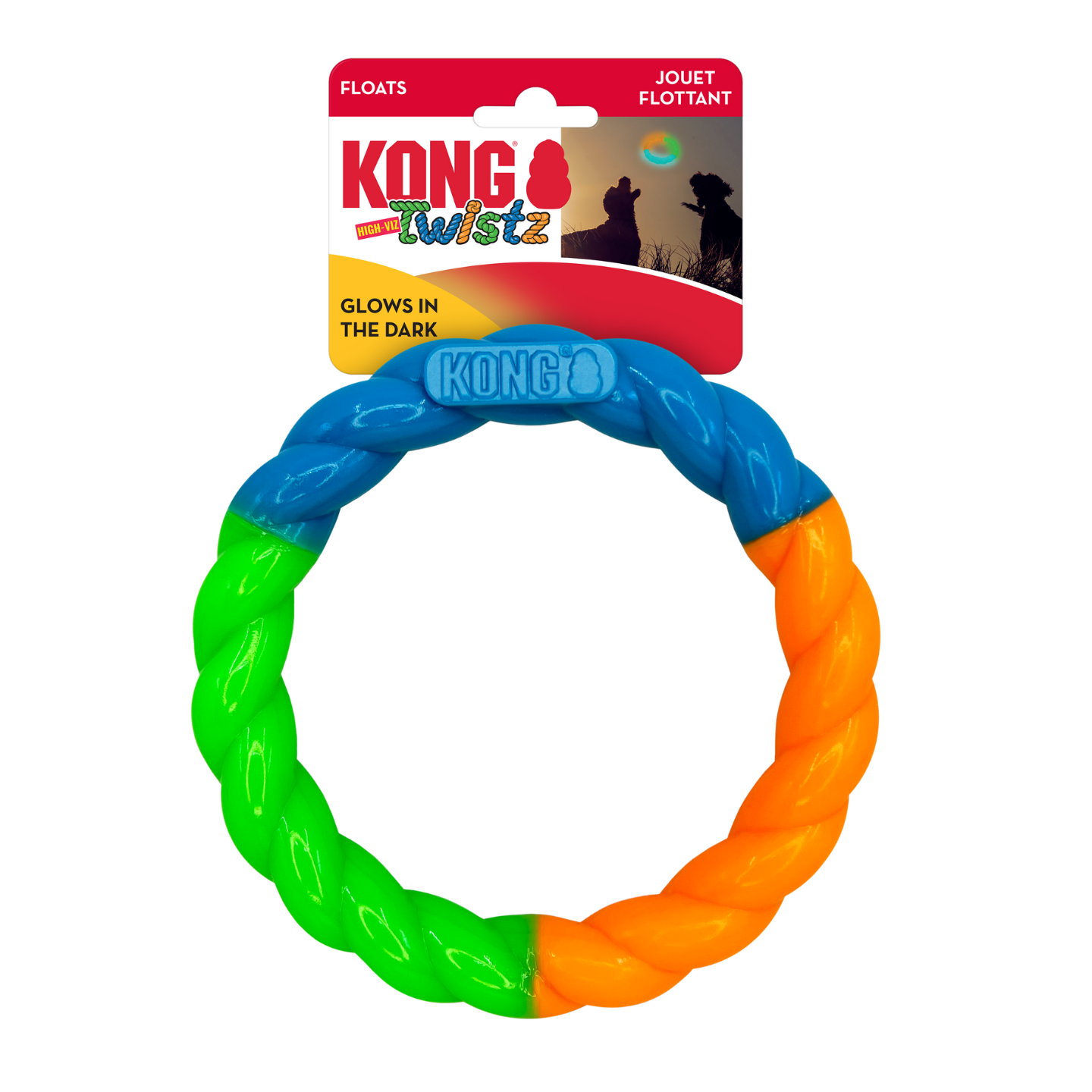 Les couleurs vives et très visibles de l’anneau KONG Twistz High-Viz en font le jouet idéal pour tous les environnements extérieurs, quelles que soient la météo et le terrain.