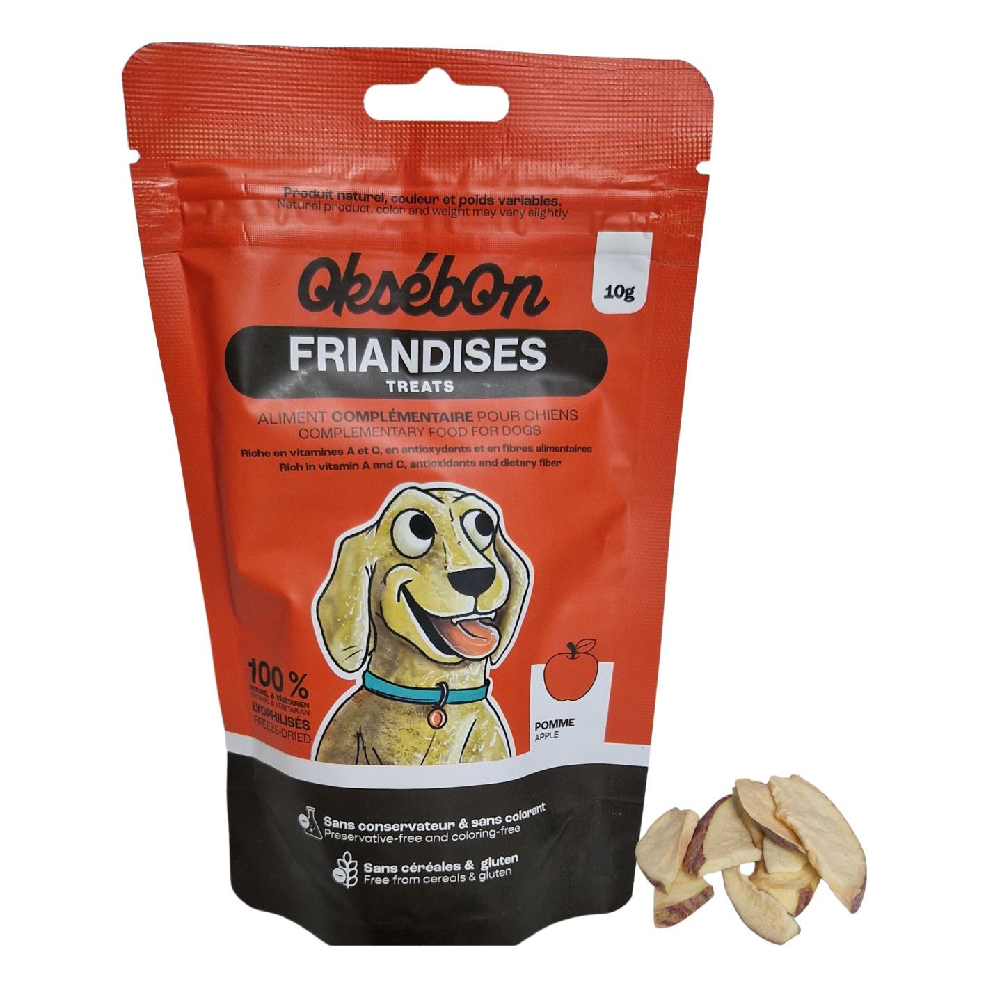Oksébon Crunch à la pomme est un aliment complémentaire naturel pour Chiens, fabriqué à 100% de pommes lyophilisées.