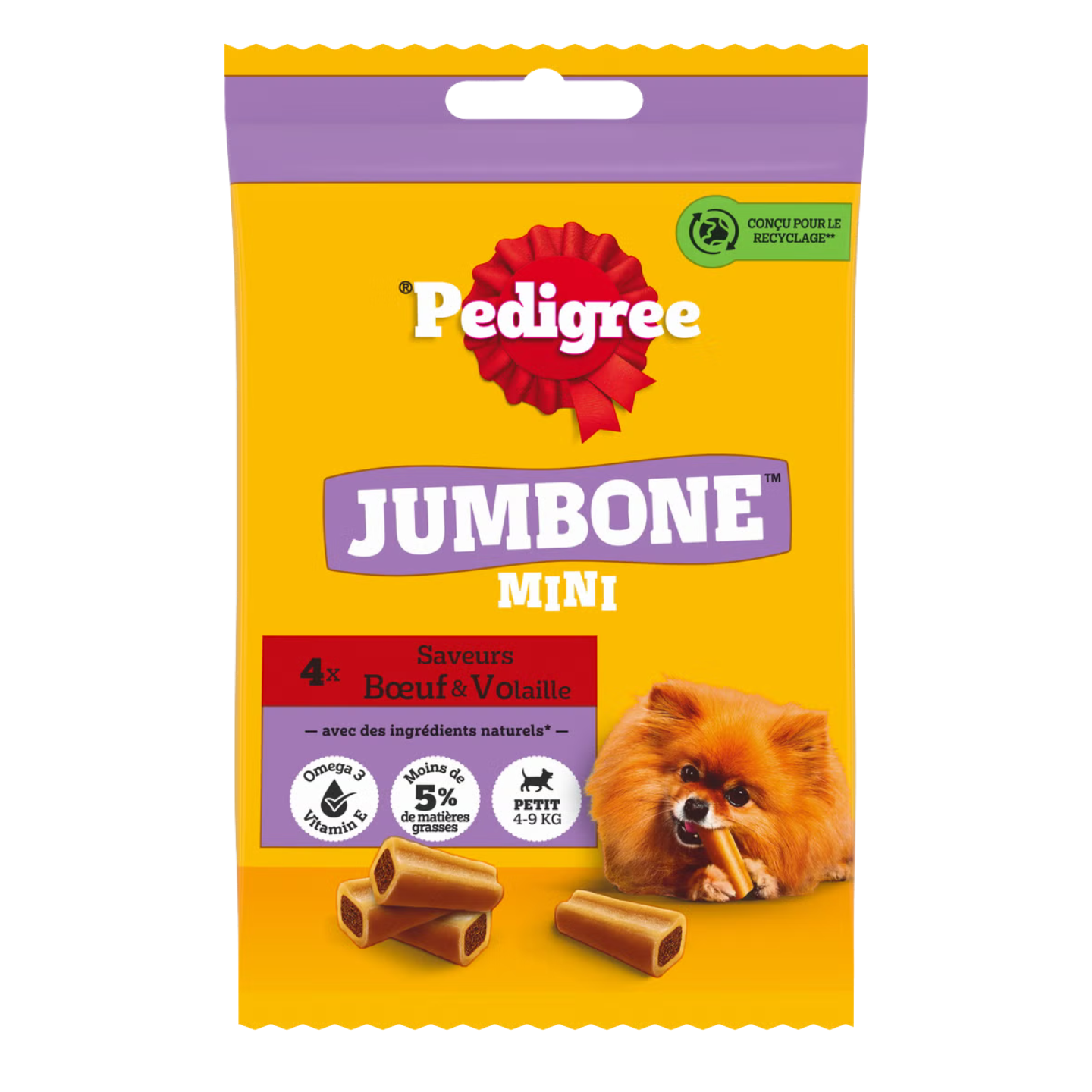 Aliment complémentaire pour chiens de petite taille – aux saveurs Bœuf & Volaille. Les chiens adorent mastiquer. Pedigree® Son Os à Mâcher / Jumbone™ est l’os à mâcher idéal pour occuper et régaler votre chien. Faible en matières grasses, ces friandises sont résistantes à l’extérieur, pour prolonger le plaisir de mâcher, et délicieusement fourrées pour une saveur incomparable. Avec des omégas 3 pour l’aider à rester en forme tout au long de sa vie. Des vitamines E pour l’aider à préserver ses défenses naturelles. Des minéraux, dont du calcium, pour l’aider à garder des os solides. Sans colorant ni arôme artificiels.