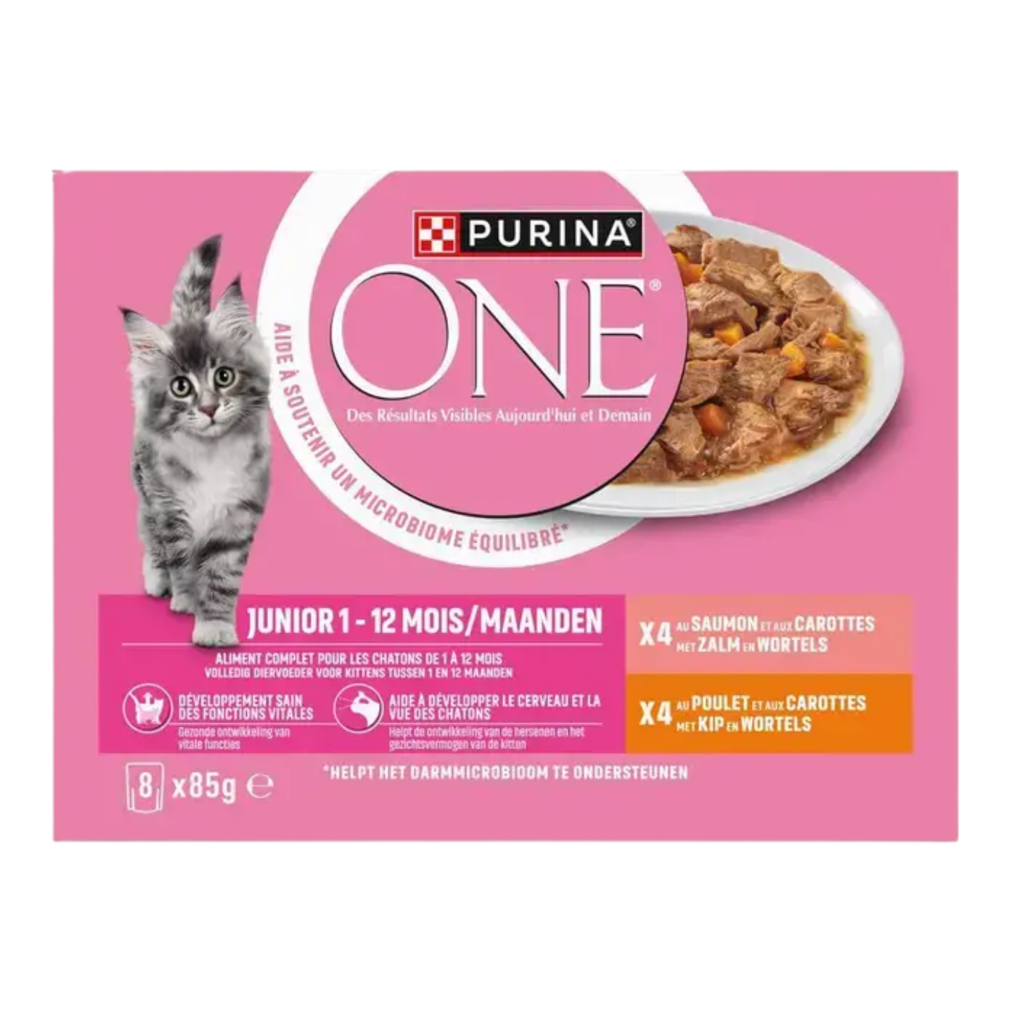 - PURINA ONE® Junior – Effilés en Sauce au SAUMON et aux Carottes: