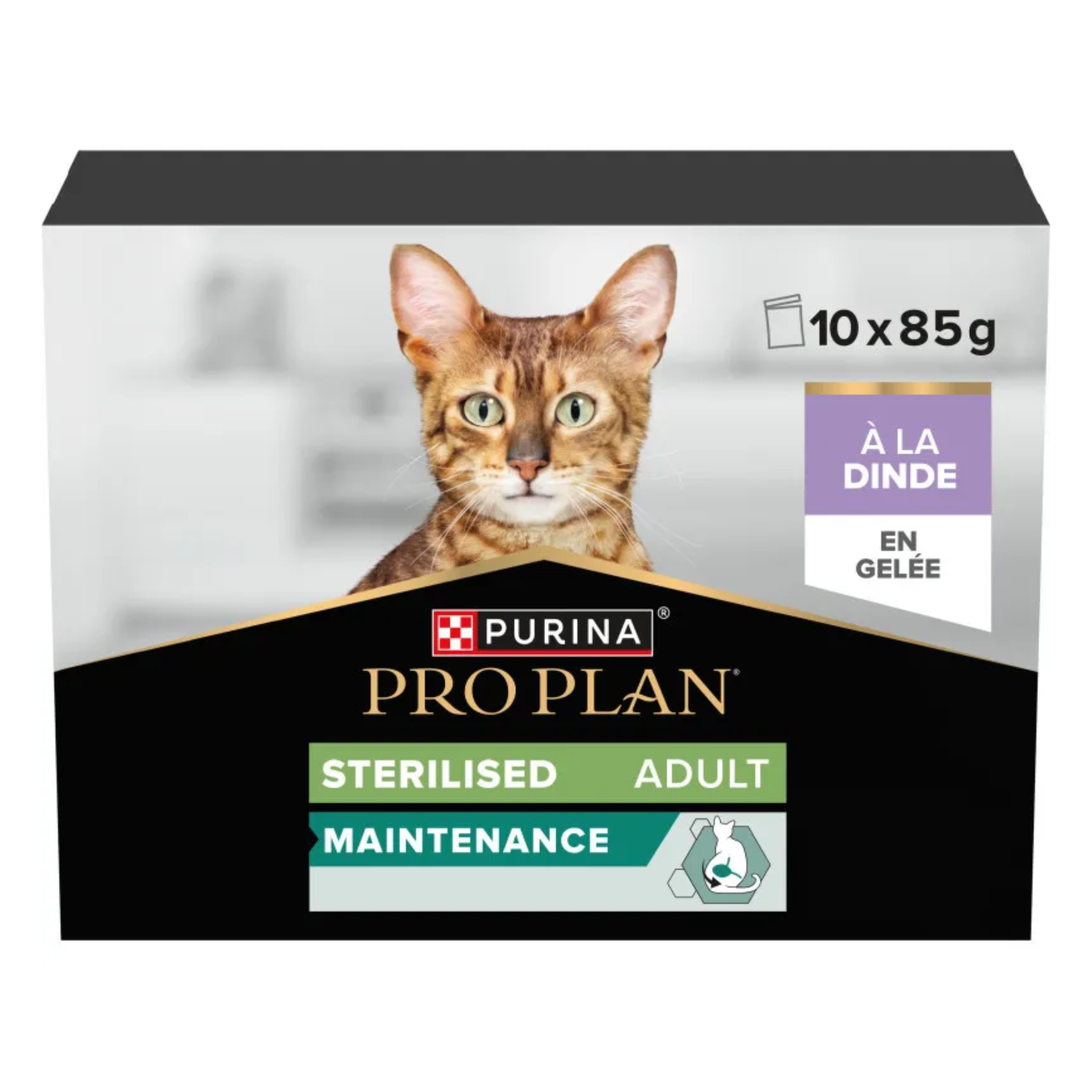 PURINA PRO PLAN Cat Sterilised Turkey Gelée sachet repas est une alimentation complète et équilibrée qui aide à maintenir un système immunitaire sain, grâce à des antioxydants tels que la vitamine E.