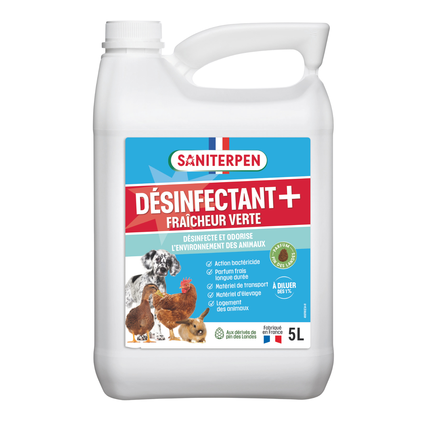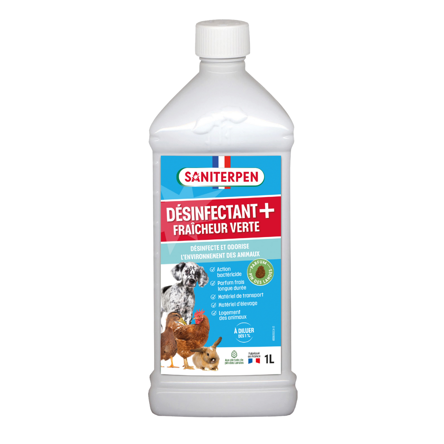 Saniterpen Désinfectant Plus Fraicheur Verte est un désinfectant concentré pour traiter l’environnement de vos chiens, chats, chevaux, volailles,… Il agit plus spécifiquement contre les bactéries souvent responsables de nombreuses maladies. Il remplace avantageusement les désinfectants dérivés du goudron de houille (crésols, acide crésylique …) et laisse une odeur forte et agréable. Il est particulièrement adapté à la désinfection des chenils, écuries, poulaillers, clapiers, camions, vans, et laisse une agréable odeur d’herbacée, très bien tolérée par les animaux.