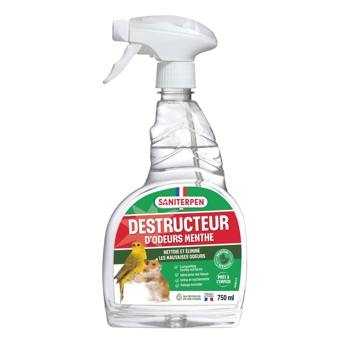 Saniterpen Destructeur d’odeurs éradique les mauvaises odeurs animales en s’attaquant aux bactéries qui en sont responsables et laisse une agréable odeur de Menthe-Eucalyptus.