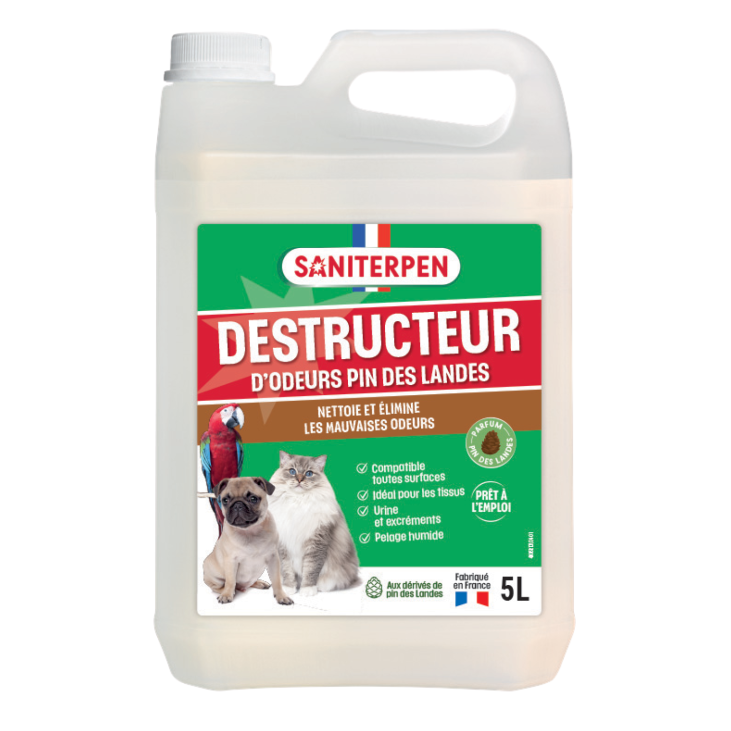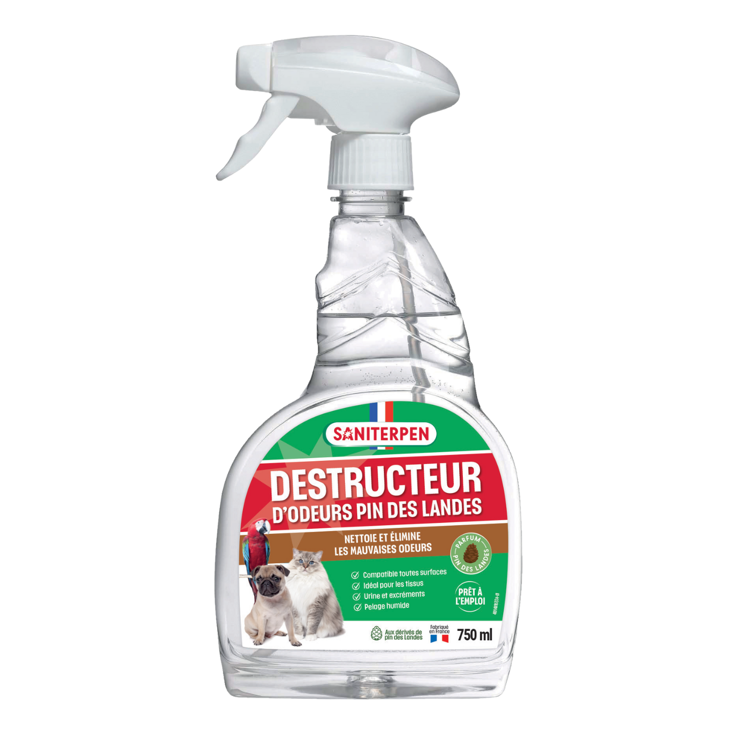 SANITERPEN Destructeur d’Odeurs Pin des Landes éradique les mauvaises odeurs des animaux de compagnie (déjections, marquage du territoire, odeurs sexuelles, pelage humide ou mouillé) tout en laissant une odeur fraîche et durable de Pin des Landes.