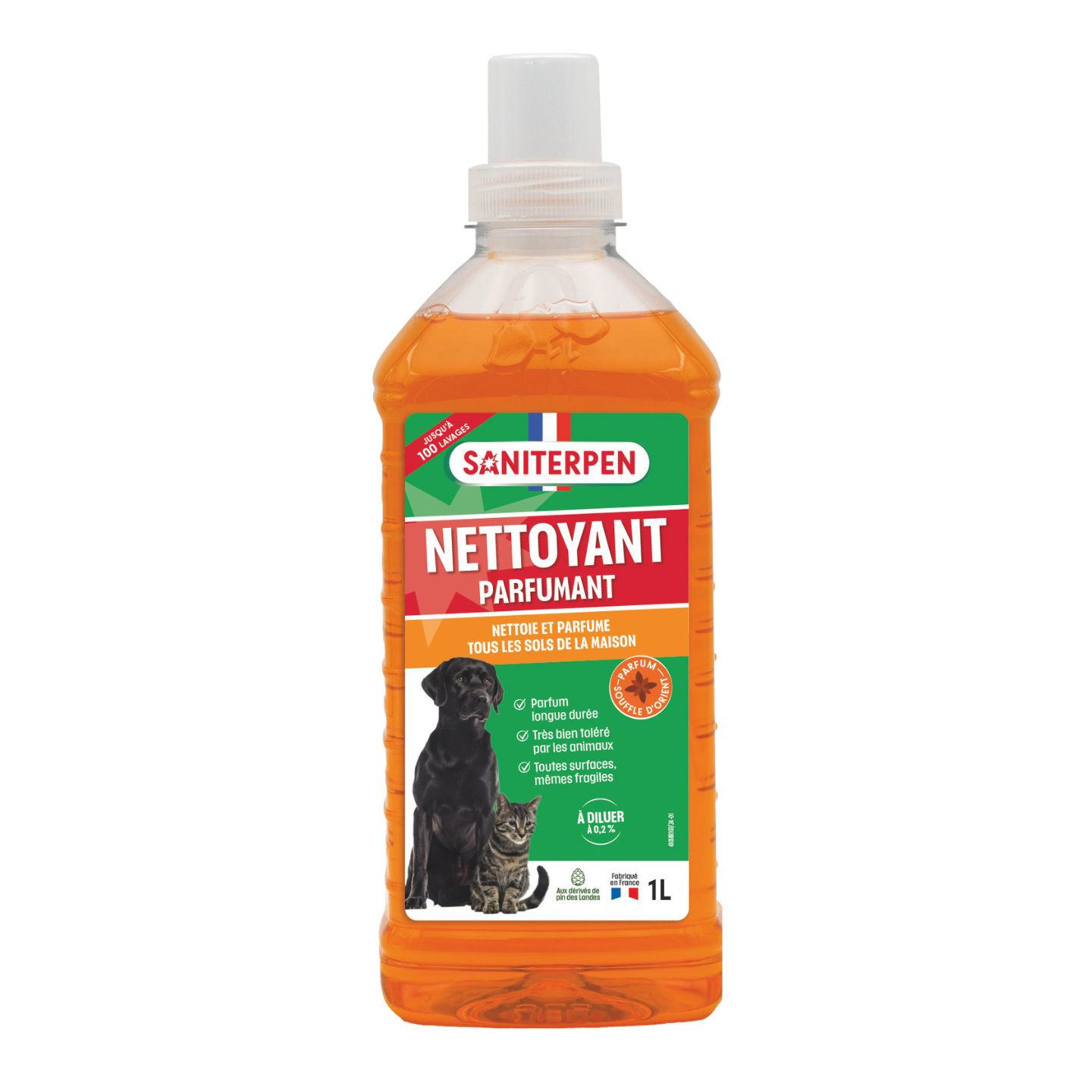 SANITERPEN Détergent Parfumant est idéal pour l’entretien d’une maison où vivent des animaux ou pour les élevages en intérieur. Grâce à sa formule concentrée, il nettoie et parfume durablement. Ainsi, les odeurs animales disparaissent, remplacées par un parfum de grande qualité aux notes florales et épicées. Sa formule très concentrée lui assure une grande efficacité même à faible dose (0.2%). Il s’utilise sur toutes surfaces et sols lavables, même les plus fragiles (parquets, stratifiés, carrelages, marbre, etc.).