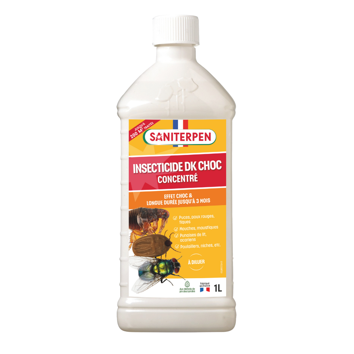 Saniterpen Insecticide DK CHOC est un puissant insecticide adulticide et larvicide concentré qui élimine efficacement les insectes grâce à sa double action (par contact et par ingestion). Adulticide et larvicide, son action se prolonge jusqu’à 8 semaines après application.