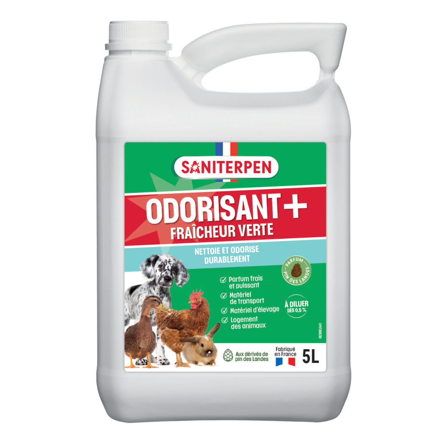 SANITERPEN Odorisant Plus Fraîcheur Verte nettoie et odorise de manière puissante et durable les locaux et les matériels d’élevage et de transports d’animaux.