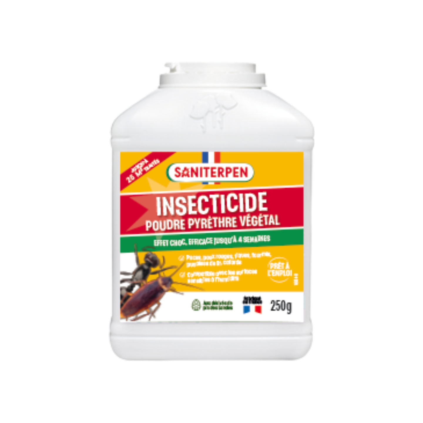 Saniterpen Insecticide Poudre au Pyrèthre Végétal est un insecticide au Pin des Landes qui élimine efficacement les insectes grâce à son effet choc.