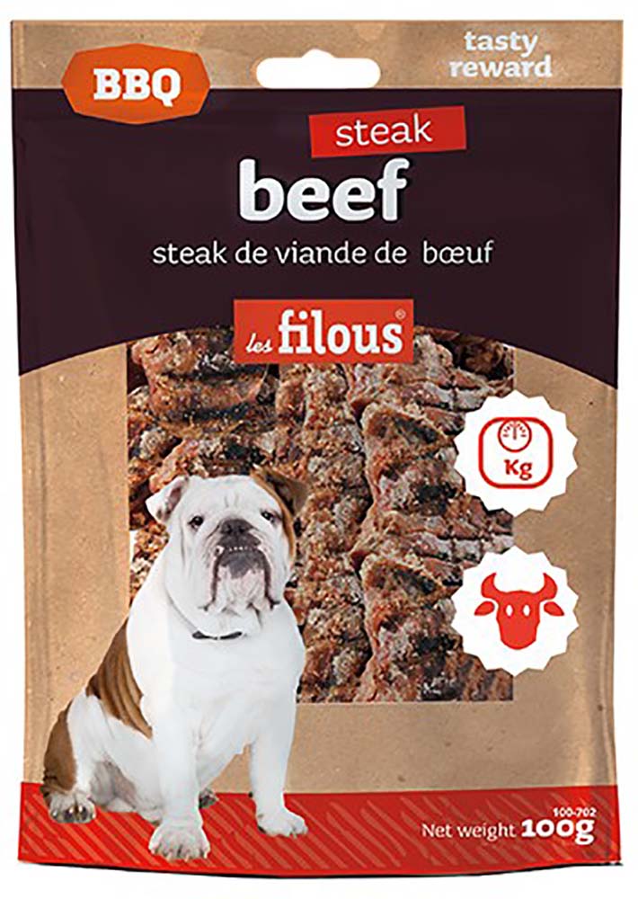 Steak de bœuf façon barbecue (BBQ). Dans un sachet fraîcheur refermable imprimé avec une grande fenêtre pour voir les produits.