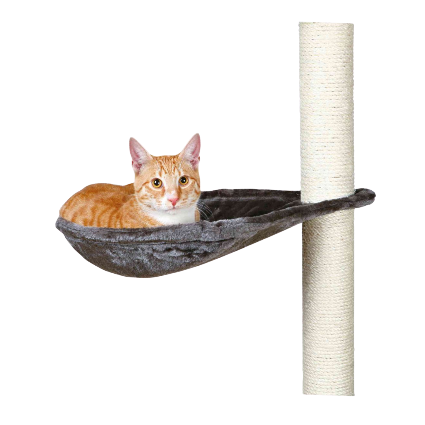 En peluche (polyester) : 280g/m². Avec cadre métal. Peut se fixer sur la plupart des arbres à chat à la place du coin repos. Diamètre : ø40cm.