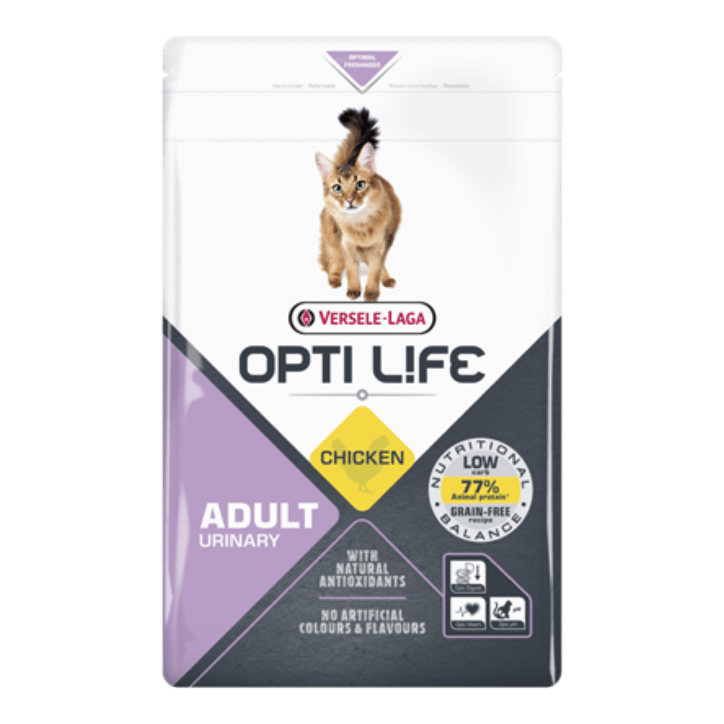 Opti Life Urinary est une formule parfaitement équilibrée à base de poulet, pauvre en glucides et sans céréales, spécialement développée pour maintenir préventivement la santé des voies urinaires de votre chat.
