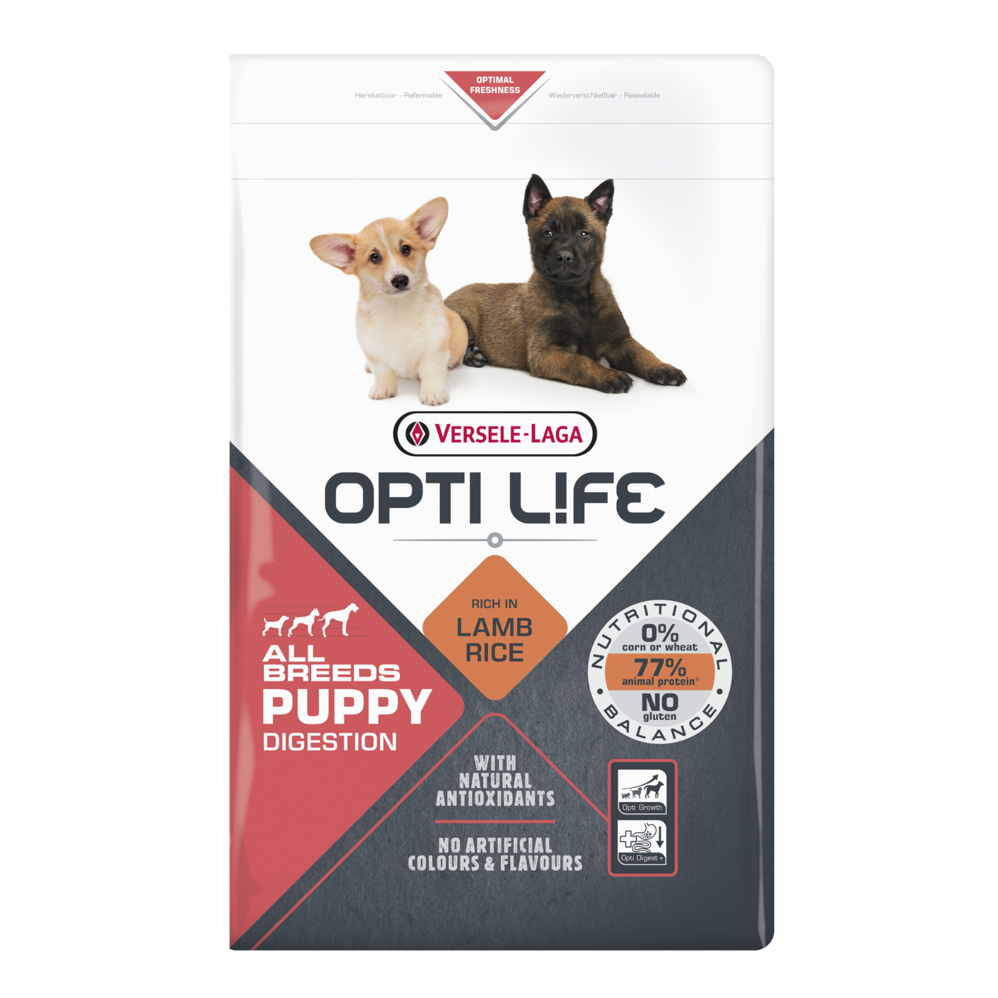 Opti Life puppy Digestion est une gamme de croquettes nutritives et hypoallergéniques riches en agneau pur et en riz, complétées par du saumon et de nombreux superaliments.