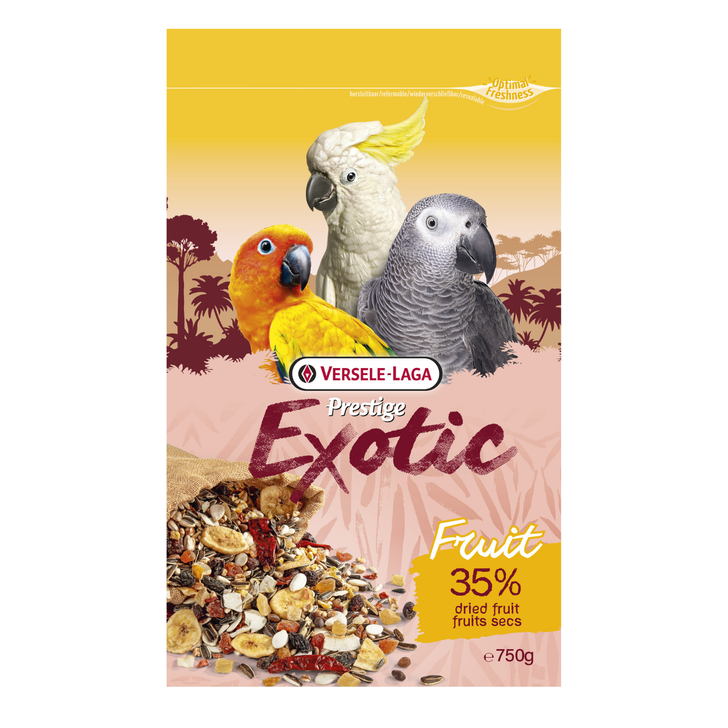 Graines, fruits (min. 35 % mélange de bananes séchées, raisins secs, cynorhodon, papaye, abricot, ananas), céréales, noix, légumes.